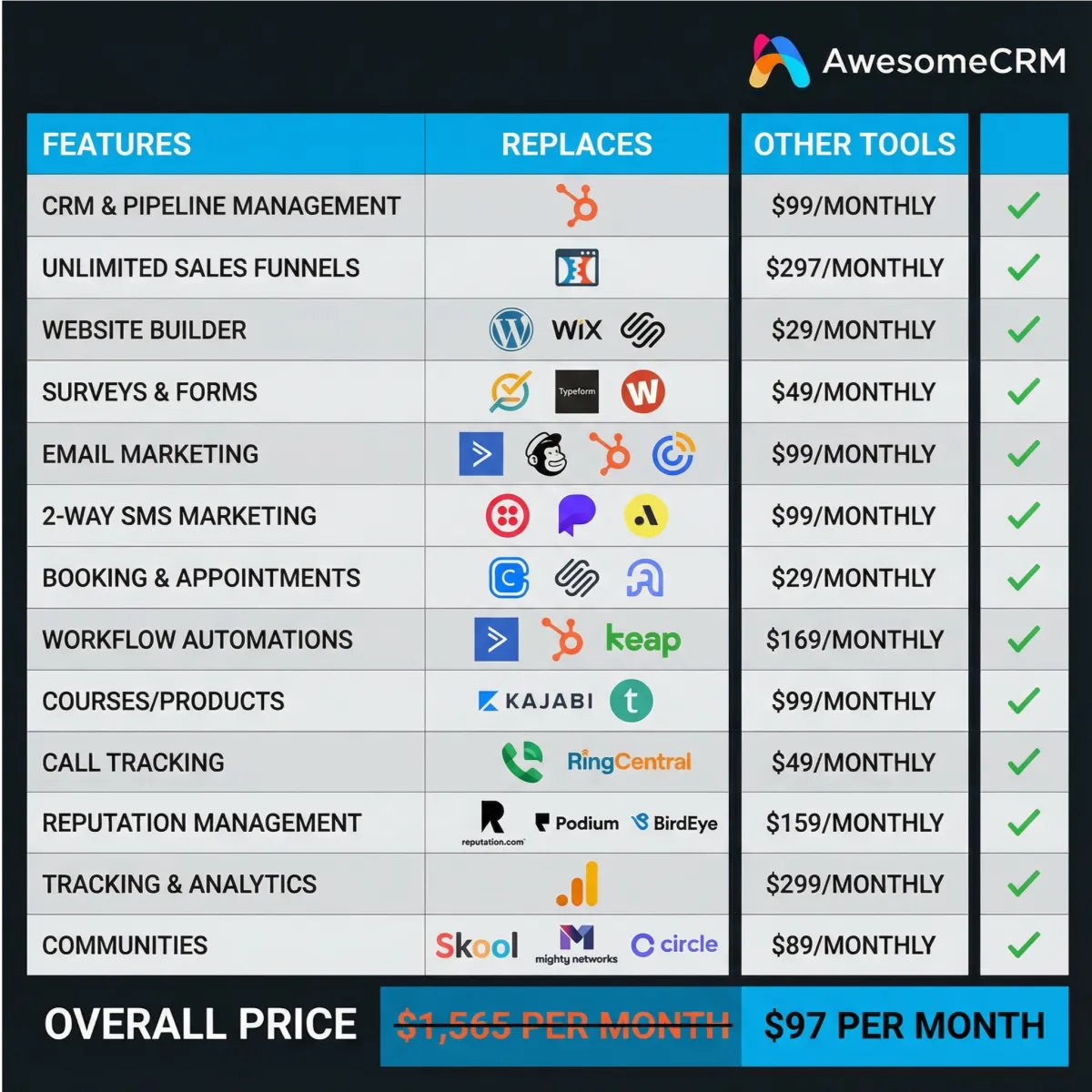 Replaces $1,565 per month of tech tools