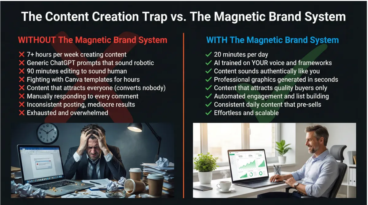 Keep trying to create content manually. Keep spending hours in Canva. Keep using generic AI and editing the slop. Keep posting sporadically. Keep watching competitors build audiences while you stay invisible.